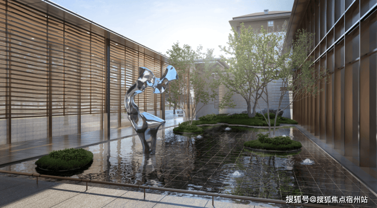 水做为贯穿兴云间整座园区最主要的元素之一,从入口处的水景雕塑《晨风艺墅》具有至关主要的地位,金属的光泽取水光的灵动交相辉映,成为空间中的点睛之笔。